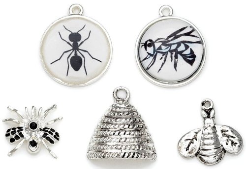 Blue Moon Token charms. This phenomenal line of charms, necklaces, bracelets, anklets, rings and more from Blue Moon is going to rock the jewelry fashion world! With all the choices to make it will be virtually impossible to just choose one! Loads of shapes, finishes, designs, construction material, themes and colors are all up for grabs! This package contains five metal, enameled and resin word and image charms in assorted shapes and sizes. Theme is Insect: 0.62 x 0.62 inch Spider charm to a 0.88 x 0.75 inch Bee Hive charm in antique silver.
